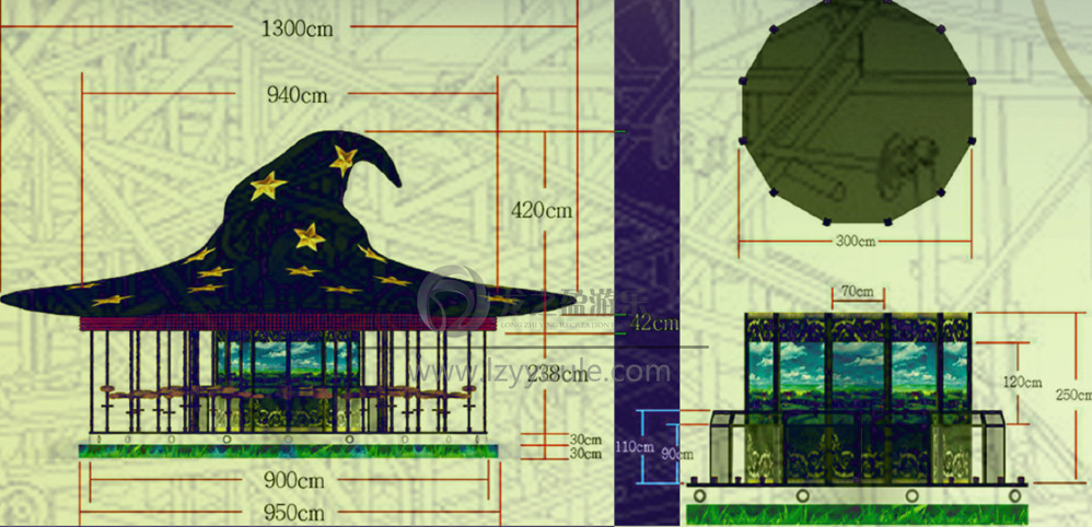 帽子上面設(shè)計(jì)了七束不同顏色的巨型燈光。頓時(shí)成為游樂場的地標(biāo)式游樂設(shè)備!