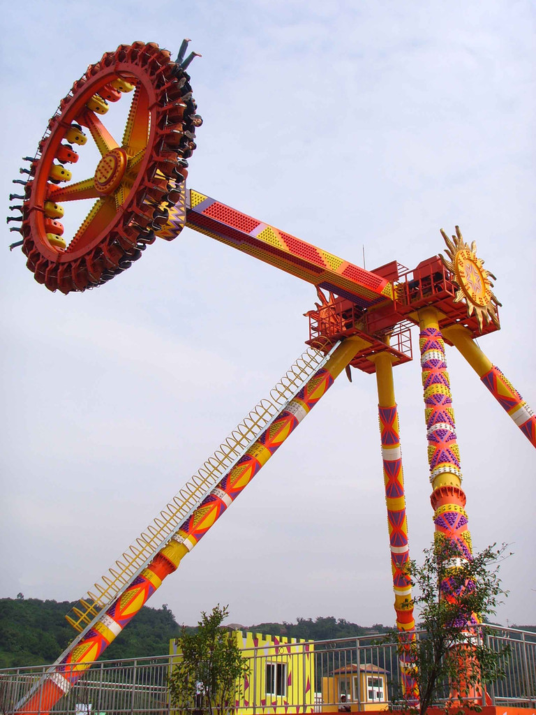 大擺錘:游樂中經(jīng)典的大擺錘,對(duì)于常去游樂園的人并不陌生。他的游樂方式是巨大的鐘擺伴隨著旋轉(zhuǎn)大幅度的往復(fù)搖擺挑戰(zhàn)心理的極限。在極易失去重心的高空中乘客門隨著擺錘搖擺的弧度,游客往往情不自禁的發(fā)出驚呼與歡笑,極大的提高了整個(gè)游樂場(chǎng)的歡樂氣氛,使許多游客留連忘返,不愿離開。