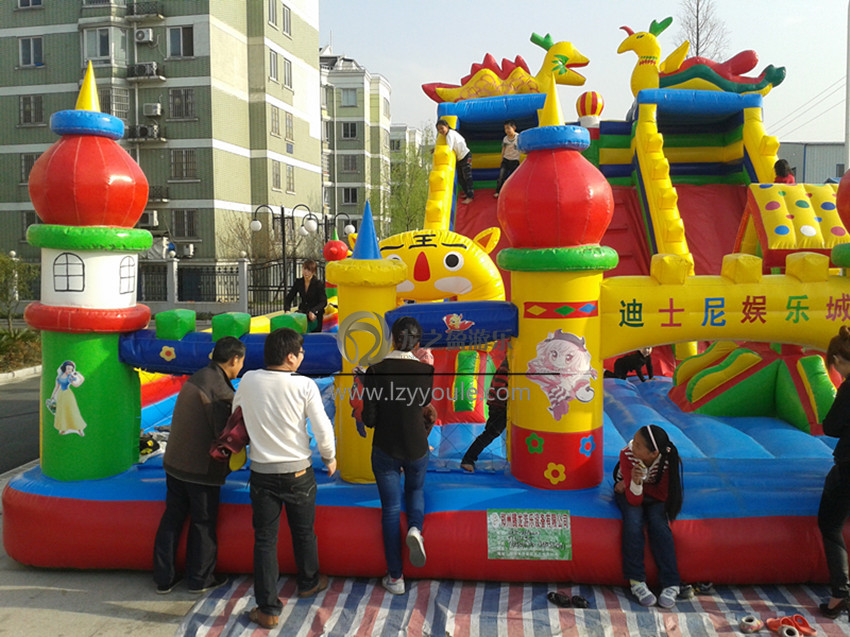 其次,龍之盈游樂設備廠家提醒,充氣類兒童娛樂設施,和其他大多數設備一樣,有它的使用期限。經營者要注意定時的檢查和保養,以免縮短其壽命。比如發現設備破損,可在破損處涂上專用膠,將其粘合,幾分鐘后便可正常使用。如果是大面積的破損,則需要專業的技術人員來進行維修。